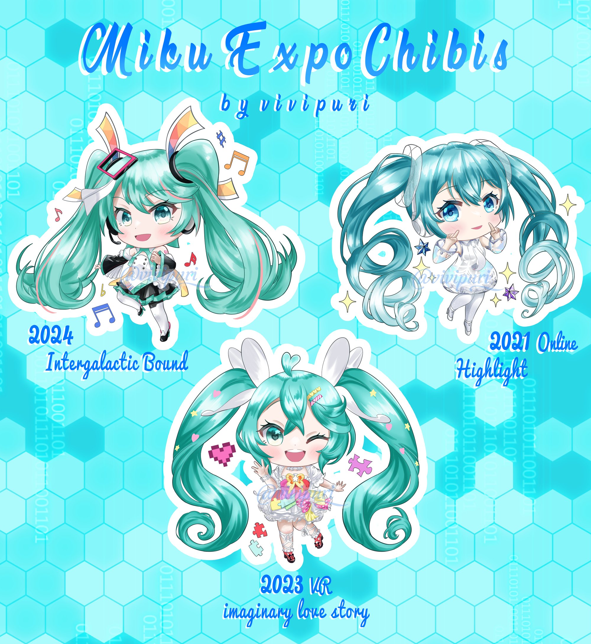 Vinyl stickers of Miku’s outfits from Miku Expo 2021, 2023, and 2024!